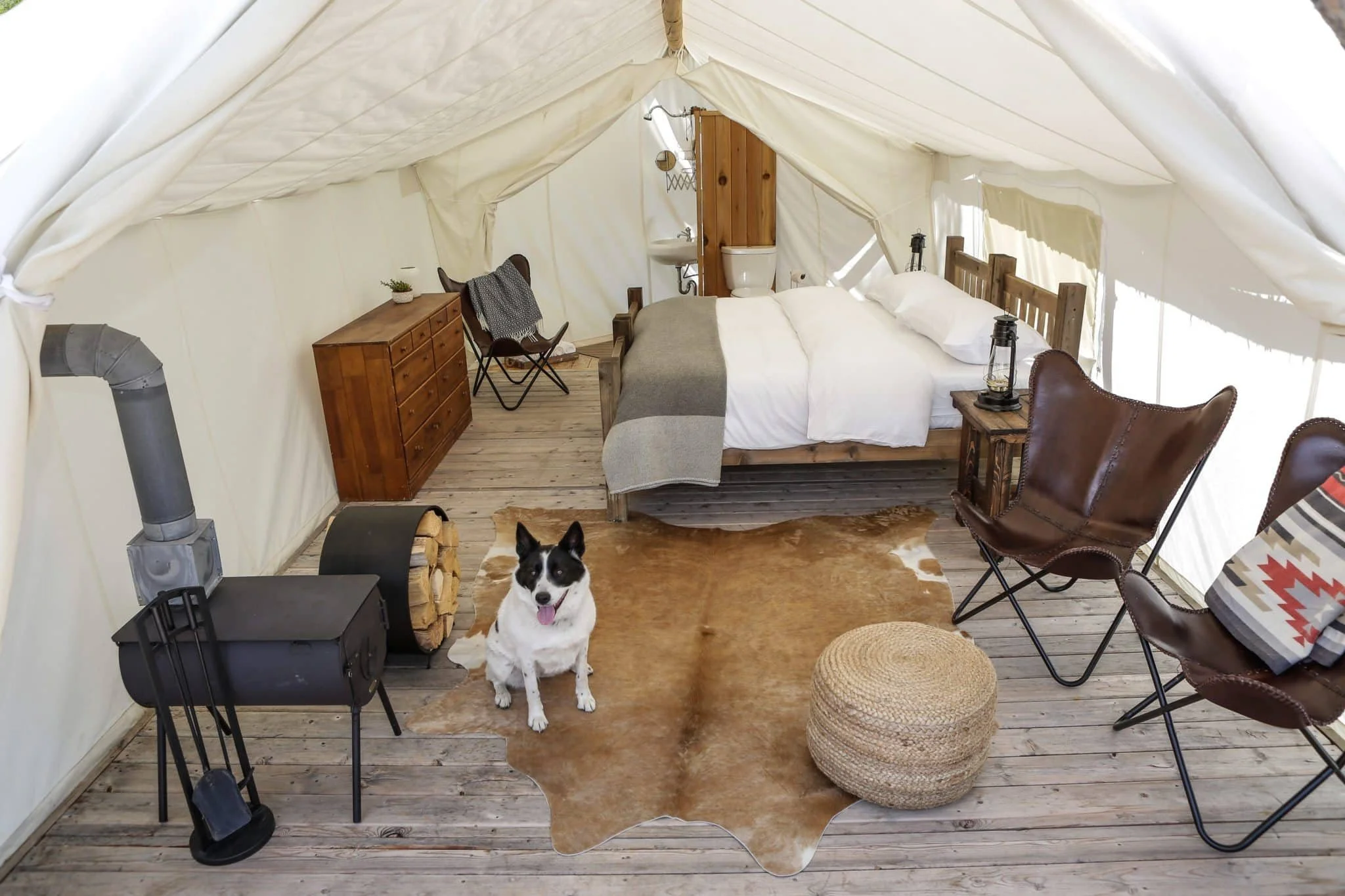 Under Canvas welcomes dogs of any size for an additional fee of $25 per dog, per stay. Dogs cannot be left unattended at any time, but if you need to leave Fido behind, be sure to reach out to your advisor and schedule dog-sitting services that are available in select location for an additional cost. At Under Canvas, each glamping tent has a king bed and furnishings, a full bathroom, and some have private decks. Pro Tip: Spring for the stargazer tent which comes with a window over the bed for a direct view of the night sky.